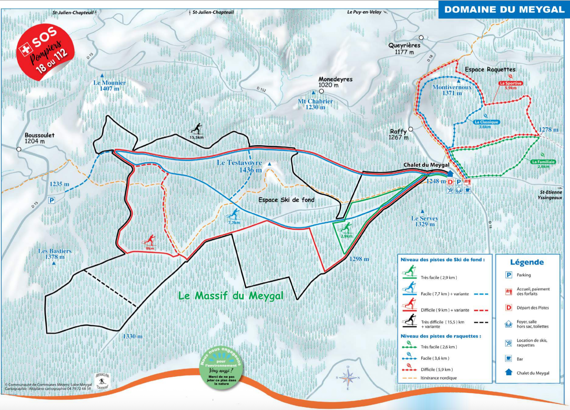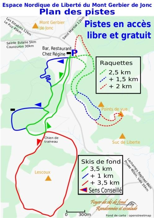 A 1400 m d’altitude au pied du Mont Gerbier-de-Jonc. L’espace nordique de liberté vous propose des circuits de ski de fond et de raquettes. De 2,5 kms à 8 kms. Location de skis, raquettes, Fatbike et luges sur place sous le restaurant » Chez Régine « . Pistes en accès libre. Damage et entretien réalisés bénévolement par le Foyer de Ski de fond de Sainte-Eulalie (les dons sont encouragés!).